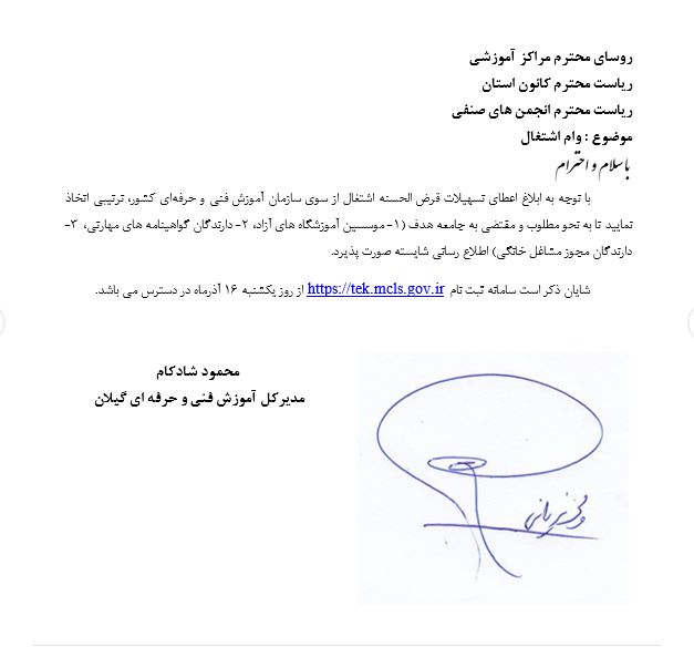 با توجه به ابلاغ اعطای تسهیلات قرض الحسنه اشتغال از سوی سازمان آموزش فنی و حرفه‌ای کشور، ترتیبی اتخاذ نمایید تا به نحو مطلوب و مقتضی به جامعه هدف (۱- موسسین آموزشگاه های آزاد، ۲- دارندگان گواهینامه های مهارتی، ۳- دارندگان مجوز مشاغل خانگی( اطلاع رسانی شایسته صورت پذیرد.