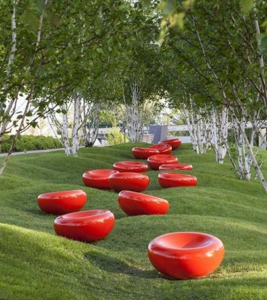 هیچ کس نمی تواند منکر تاثیرات عمیق رنگ بر فضا باشد، همنشینی رنگ ها به راحتی می تواند طراحی ساده یک مبلمان شهری را جذاب تر و حرفه ای تر جلوه دهد. به عکس بالا نگاه کنید، انتخاب رنگ قرمز برای صندلی های ساده ی یک محوطه با رنگ سبز هوشمندانه ترین انتخاب بوده است چرا که رنگ سبز و قرمز همنشینی جذاب و پر انرژی ای دارند و باعث می شوند تا فضا حالت یکنواختی و سکون خودش را ازدست بدهد.